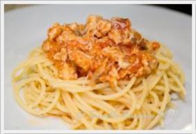 Esquentar o óleo e fritar o frango até dourar. Juntar a cebola, o alho e refogar por 5 minutos. Adicionar o purê de tomate, sal e pimenta e deixar cozinhar em fogo baixo por 15 minutos. Cozinhar o macarrão em água com sal e um fio de óleo até ficar al dente. Escorrer, juntar o molho, salsa, cebolinha e servir em seguida acompanhado de queijo parmesão ralado.